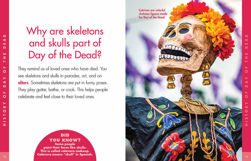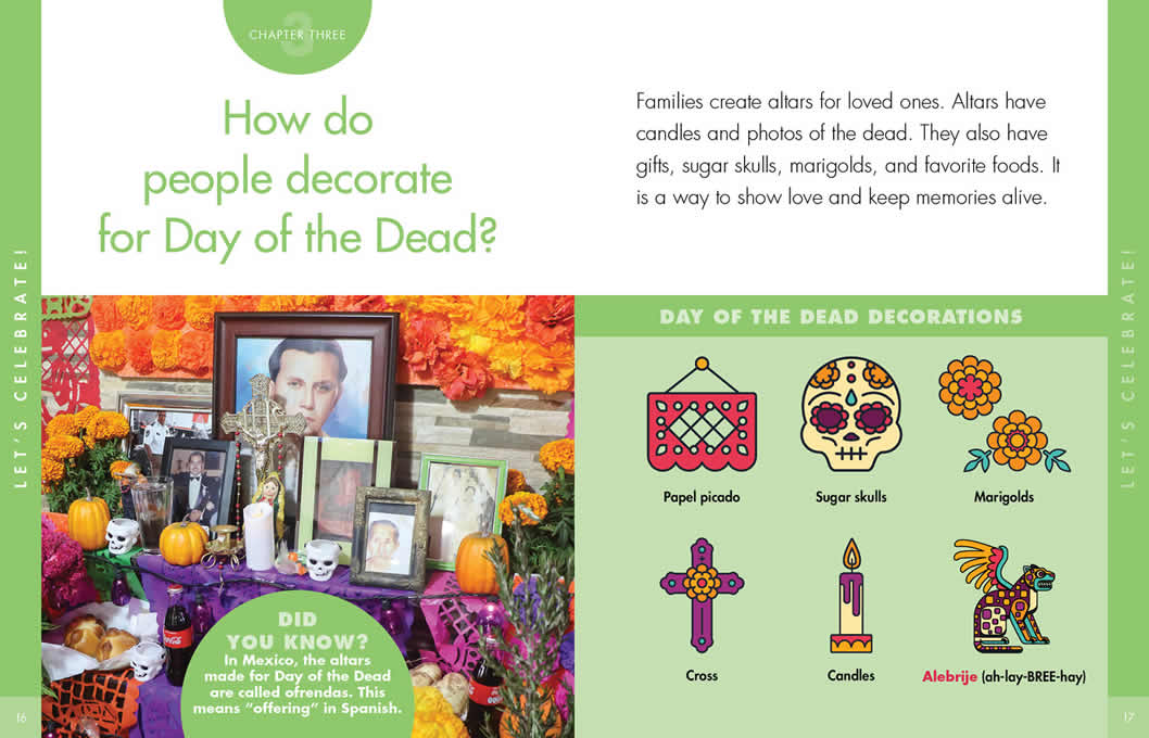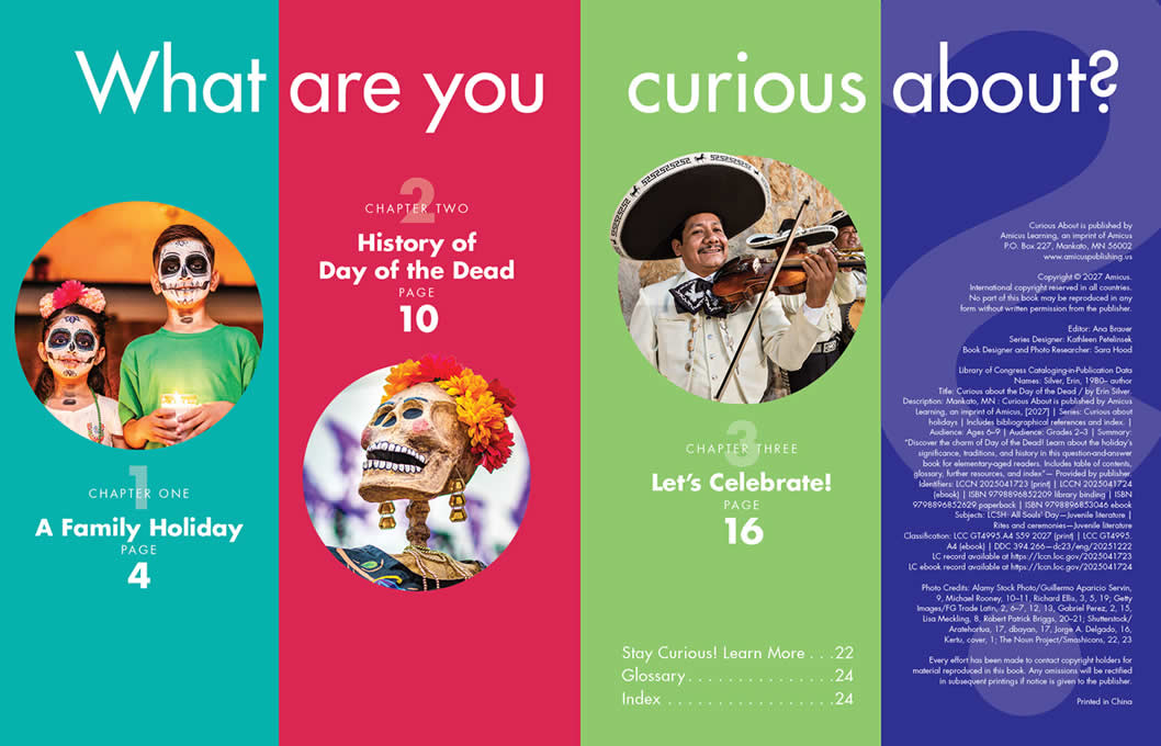 What is Day of the Dead? Spark kids’ curiosity with questions and answers about Day of the Dead, or Día de los Muertos. Readers will discover the history of this joyful Mexican holiday, how families honor loved ones with altars, and more. From sugar skulls to mariachi bands, young readers will explore how this colorful celebration honors life and death. Packed with “Did You Know?” facts and infographics for visual learners, this book is perfect for kids eager to learn more about global holidays. A Stay Curious! feature encourages kids to ask more questions and practice research skills. Includes table of contents, glossary, further resources, and index.