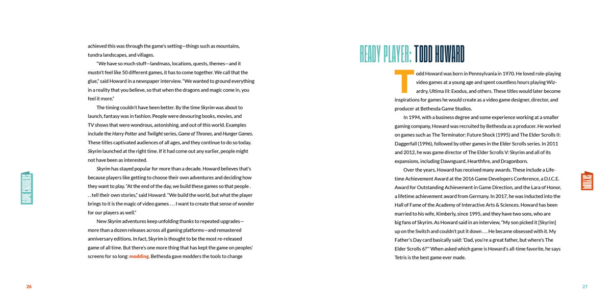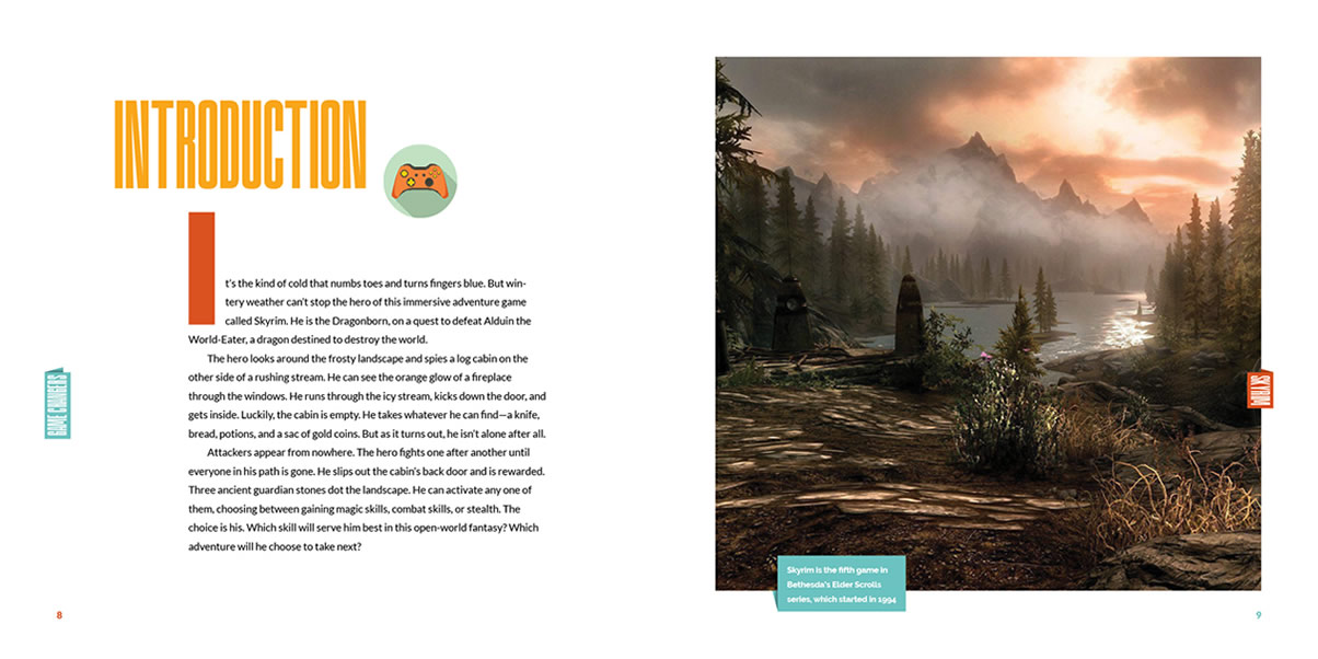 Computer gaming is fun, but it’s also serious business! Level up and learn about Fortnite, Minecraft, Rocket League, and other video games and online game platforms that have forever changed the world of play. For readers age 12 and up, each title explores what the featured technology property is, its development history, programming innovations, and impact on everyday players and esports competitors alike. In the world of computer gaming, The Elder Scrolls V: Skyrim (or simply, Skyrim) is a game changer. It’s not only a standout product but also big business. The action role-playing game, filled with dragons and other fantasy creatures, has helped catapult the global video game industry’s yearly revenue to an estimated $347 billion. For readers age 12 and up, this STEM-based title dives inside the technology property and examines its features, design and development history, programming innovations, and reception from players. Collaborations and spin-offs are also discussed. Includes a glossary, sidebars, and profiles of notable creators.